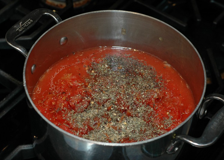 - Heat the butter and olive oil in a medium soup pot. Add the onion and ½ teaspoon salt and sauté over medium heat until the onion is translucent and starting to become golden (about 10 minutes). Add the garlic and sauté another 1-2 minutes. Add the tomatoes, water, remaining ½ teaspoon of salt, red pepper flakes, basil, and sugar and stir to combine. Bring the mixture to a boil, then lower the heat and cook for 15 minutes.