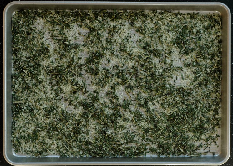 When you make the finishing salt, I recommend using a good quality sea salt (I like Maldon) and any combination of fresh (not dried) herbs that you like. I didn’t include garlic (since my hubby is sensitive to it), but if you are partial to that odiferous (and highly nutritious) herb, then by all means include it.