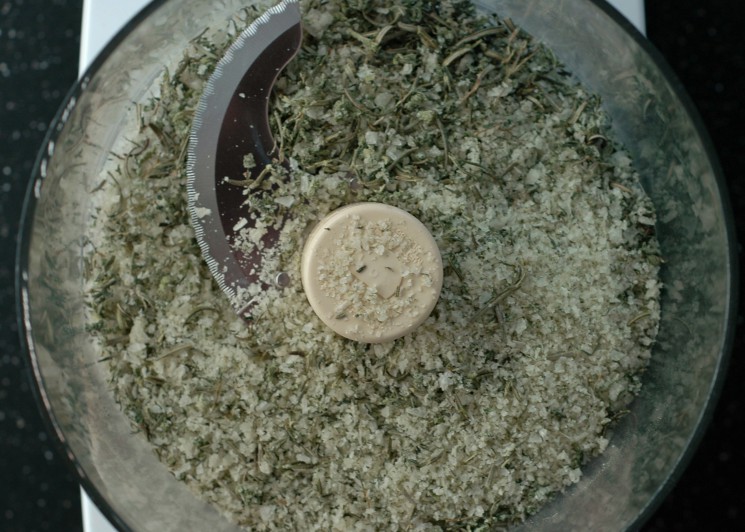 - Return the mixture to the food processor and pulse, for 2-3 seconds each pulse, until both the herbs and salt are finely ground and have roughly the same consistency.