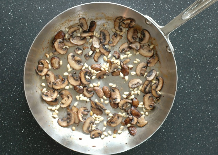 While the soup is cooking, clean and trim the mushrooms, and slice each one into 5-6 slices.  In a saucepan or non-stick skillet, heat the olive oil just until it starts to shimmer.  Add the sliced mushrooms and salt, and cook, stirring occasionally, until the water in the mushrooms is released and has evaporated (about 8 minutes).  At that point, the mushrooms will start to stick to the pan.  Add the pine nuts, and stir the mushroom-pine nut mixture occasionally for another 3-5 minutes.  (Be careful not to burn the pine nuts.) Set aside until the soup is ready to be served.  (The garnish can also be made beforehand and refrigerated.  When you are ready to use it, remove it from the refrigerator and briefly warm it in a skillet or the microwave oven.