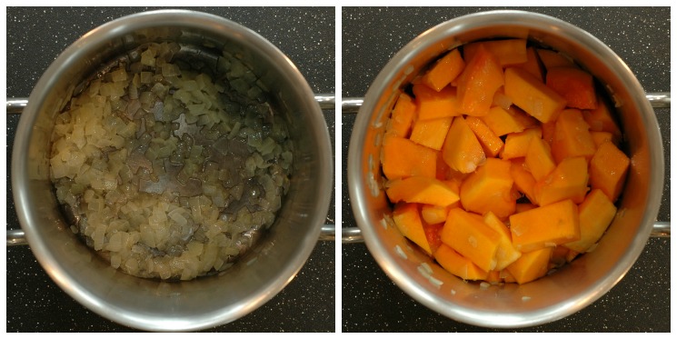 2.   In a large soup pot, heat the olive oil just until it starts to shimmer. Add the diced onion and ¼ teaspoon of salt and sauté over medium heat until the onion is translucent and starting to become golden (about 10 minutes).  Add the squash (whether fresh or frozen) and stir until the pieces are coated with olive oil, about 3 minutes longer.  Add the chicken stock, water, thyme, bay leaf, nutmeg, and remaining ¼ teaspoon of salt, and stir gently to combine.  Bring the mixture to a boil, then immediately lower the heat and simmer, covered, until the squash is very tender, 25-30 minutes.  (If using frozen squash, the pieces may stick together until they have thawed.  If that occurs, stir once or twice while the soup is simmering.)