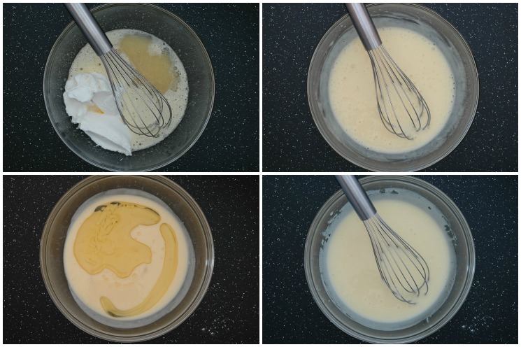 3. Beat the eggs in another medium size bowl. Whisk in the lemon juice, yogurt and sugar until smooth. Let the mixture sit for a few minutes to let the sugar dissolve. Add the olive oil and almond extract, whisking again until the mixture is smooth.
