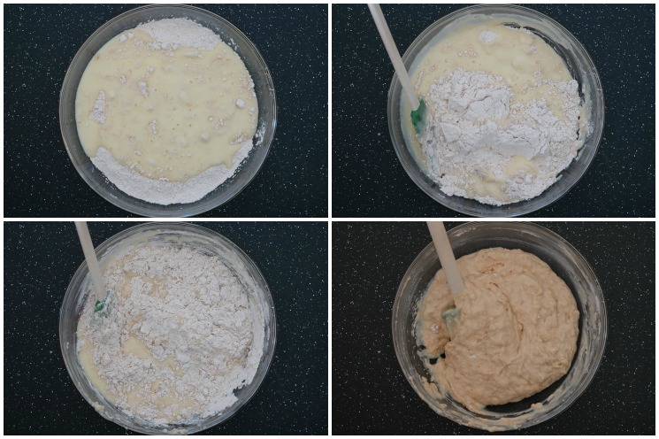 4. Quickly pour the wet ingredients into the bowl with the dry ingredients and slowly and gently stir to combine. I use a large spatula that I scrape along the inner curve of the bowl turning the batter that collects on it into the center of the bowl. Stir until the ingredients are combined and there are no large pockets of dry ingredients. The mixture will be lumpy. Be careful not to overmix.