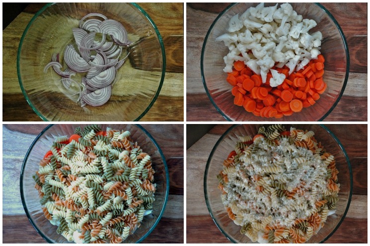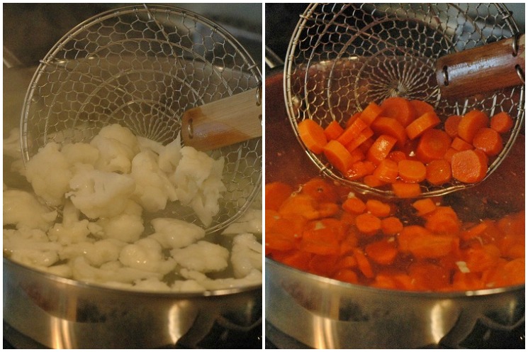 2. Blanch the cauliflower and carrots: After the water has come to a boil, place the cauliflower florets in the boiling water and cook for 2-3 minutes. Remove the florets from the boiling water using a slotted spoon or wire skimmer. Immediately submerge the florets in cold water or rinse them in a colander under cold running water in order to stop the cooking process. Repeat this process for the carrots. Place both the blanched cauliflower and carrots in the mixing bowl with the onion.