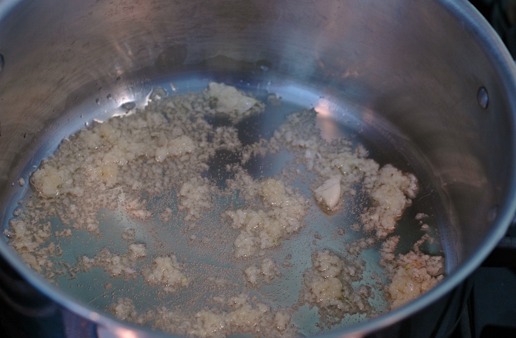 2. Heat the oil in a large (at least 4-quart) saucepan or Dutch oven over medium-low heat. Add the garlic and cook, stirring often, until it is softened, about 5-10 minutes. (Be careful not to burn it.) Stir in the red chile flakes (or cayenne) and let them heat for 15 seconds to release their flavor.