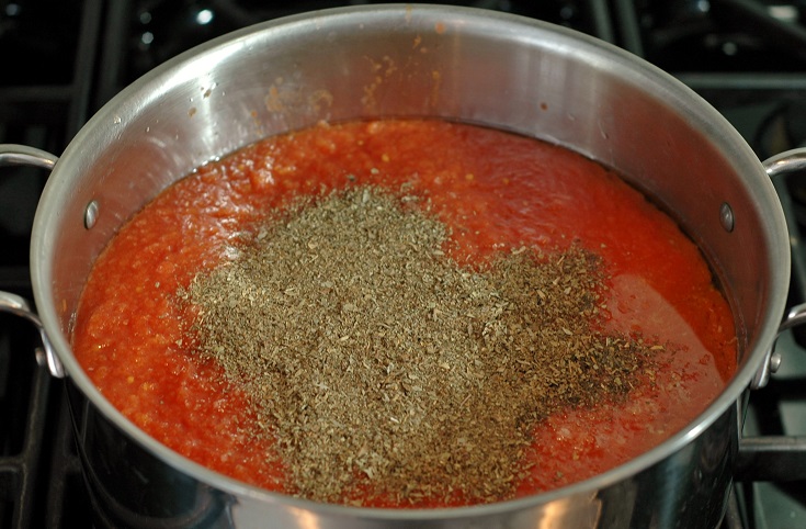 3. Add the processed tomatoes with their juices, salt, and dried basil to the pan. Stir to combine. Over medium heat, bring the contents of the pot to a boil, stirring frequently, and then reduce the heat to maintain a simmer. Cook for 1 hour. Pools of orange may appear on the surface, which means the sauce is done.