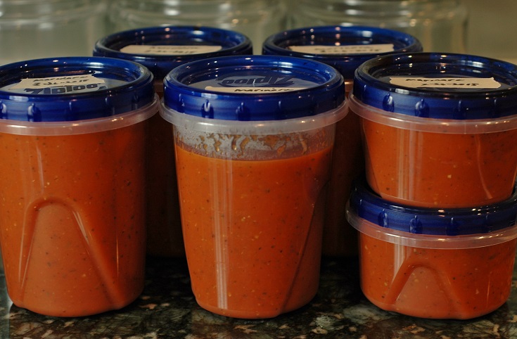 All of that said, I urge you to try my recipe for marinara sauce if only because it’s amazingly easy. It’s based on one I saw in Fine Cooking more than ten years ago except that I cut back on the oil and salt, choose garlic over the onions, process the tomatoes in a blender (since I like a smoother marinara sauce), and during the winter months substitute dried basil for fresh. (Also, the instructions call for it to be made on the stove over medium heat, but you could also make it in a crock pot. I would just cook the garlic or onions in a small pan on the stove before adding them to the crock pot.) One batch makes about 10 cups, but you can easily double the recipe (which I always do) so you have a good supply that can be stored in the freezer for future use.