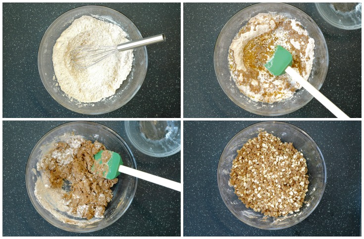 3. Make the base and topping: Preheat the oven to 350°F (175°C). Melt the butter either in the microwave or on the stove top. While the butter is melting, place the white whole wheat flour, cinnamon, salt, and baking powder in a bowl. Add the brown sugar, breaking up any lumps with your hands. Whisk to combine. Add the melted butter and vanilla and stir until the dry ingredients and butter are well combined. Add the oats and stir to combine.