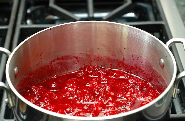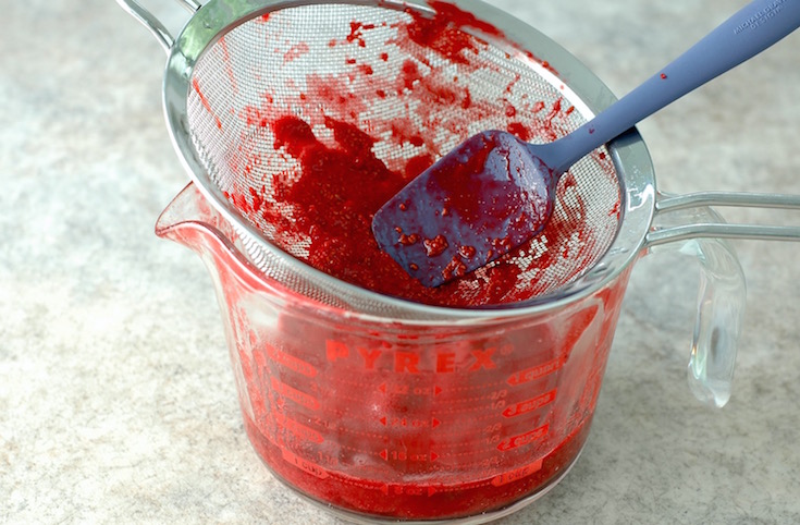 2. While the crust is baking, prepare the raspberry puree: Place the raspberries and the tablespoon of water in a large saucepan over medium heat. Gently heat the raspberries, stirring frequently, until they have a liquid consistency and have thoroughly broken down, about 15 minutes. (Be sure not to boil the raspberries, or you will may lose too much water through evaporation, resulting in a smaller quantity of puree.) Transfer the raspberries to a fine mesh strainer set over a bowl or large measuring cup. Using the back of a large spoon, press on the top of the raspberries so that the puree is forced through the strainer and into the bowl, leaving the seeds in the strainer. You should end up with about 1 cup of puree. Stir in the 1/2 cup of lemon juice, and then set aside. Discard the seeds.