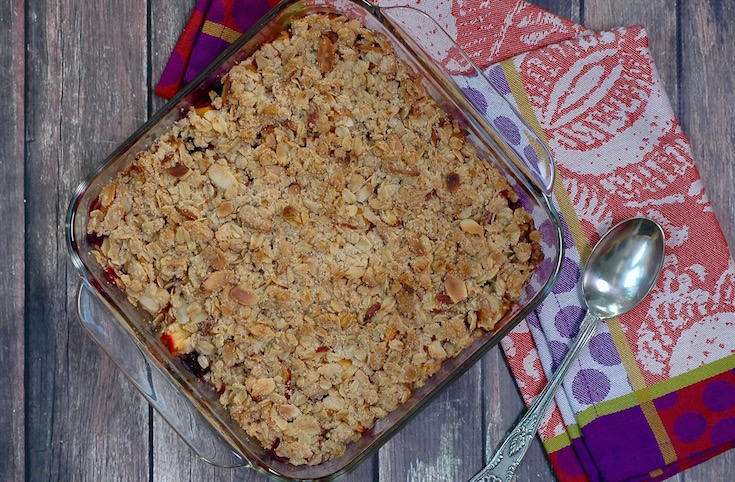 Equally important, my fruit crumble is a much healthier alternative to other sugary desserts. Its ingredients provide a bounty of healthful nutrients, including phytochemicals (fruit and almonds), healthy fats (almonds and olive oil), and fiber (fruit, almonds, oats, and whole wheat flour), without the downside of a large amount of added sugar.
